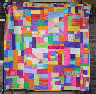 The Q4 Winner of a surprise package from Marci Girl Designs goes to Cathy who blogs at Sane, Crazy, Crumby Quilting and she finished this lovely scrappy quilt: