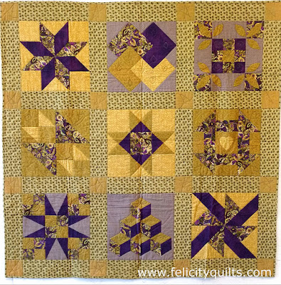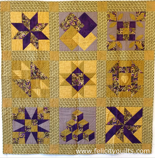 This is my first quilt - the classic beginner's sampler with one large scale fabric plus some blenders.